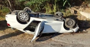 Un automóvil fue abandonado por quien lo conducía, luego de que volcara al chocar contra un poste de telefonía en...