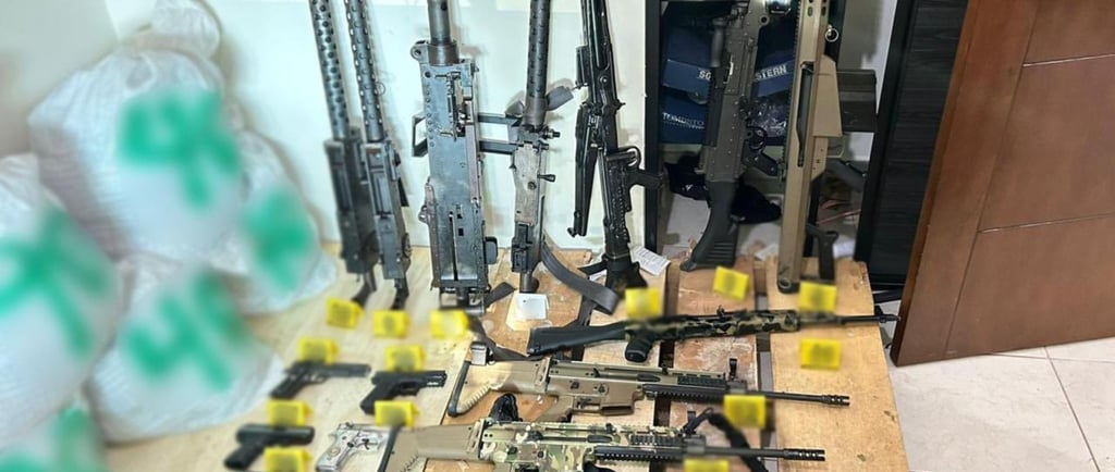 Por lo anterior, los efectivos desplegaron un dispositivo de seguridad y cumplimentaron la orden de cateo en el lugar, donde hallaron 32 armas largas, cinco armas cortas, cargadores, cartuchos, así como 80 litros y 150 kilos de sustancias ilícitas, además de equipo táctico.