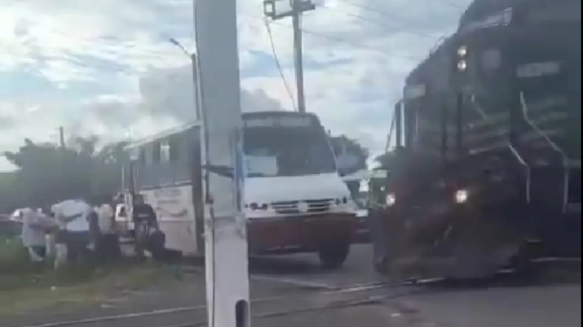 Este lunes se viralizó, en redes sociales, un video que muestra a un camión del servicio urbano de la ruta Puente Moreno, en Veracruz, a punto de ser arrollado por un tren de carga, luego de quedar detenido sobre las vías del tren.